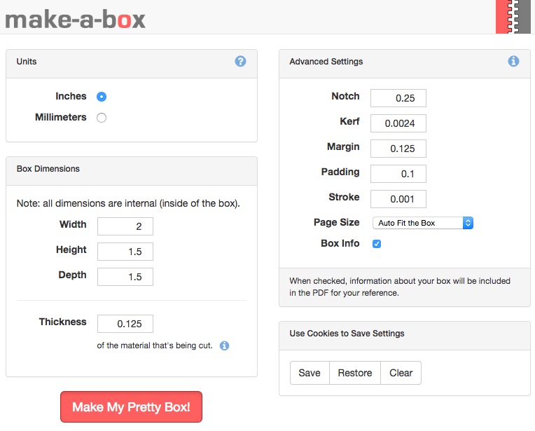 Rahulbotics BoxMaker ---- It was working a few months ago, but as of publishing this blog, it’s been taken down, though the source code remains. I used this tool to create about a dozen of my first laser-cut boxes ever, and it worked OK. Note that Adam Phelps has a slightly better fork with easier interface with command line arguments.
